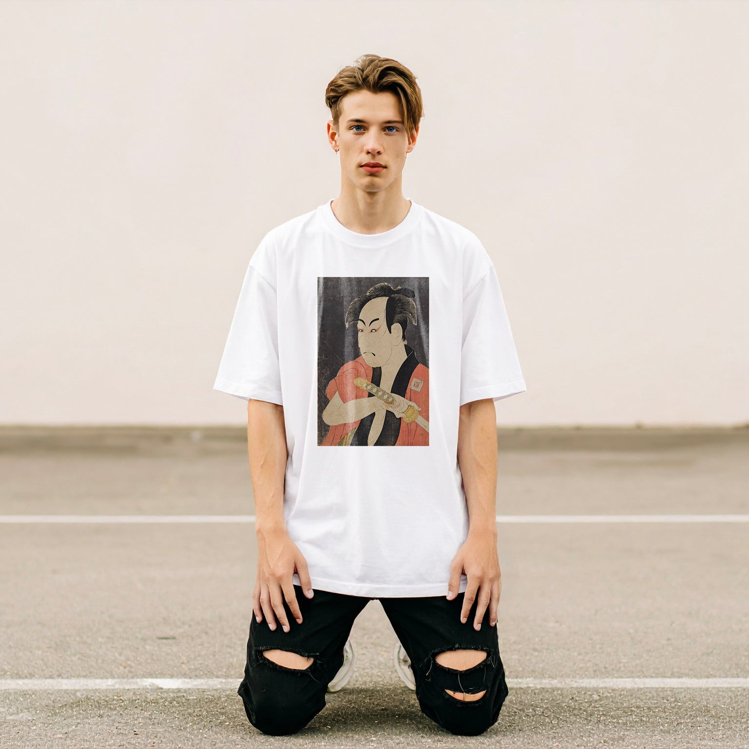 This ukiyo-e depicts a tragic Kabuki scene of a family dispute. Yakko Ippei, portrayed by Ichikawa Omezo I, is robbed by the villain Edobei. Though Ippei brandishes his sword defiantly, his backward stance subtly reveals his complex psychological state.