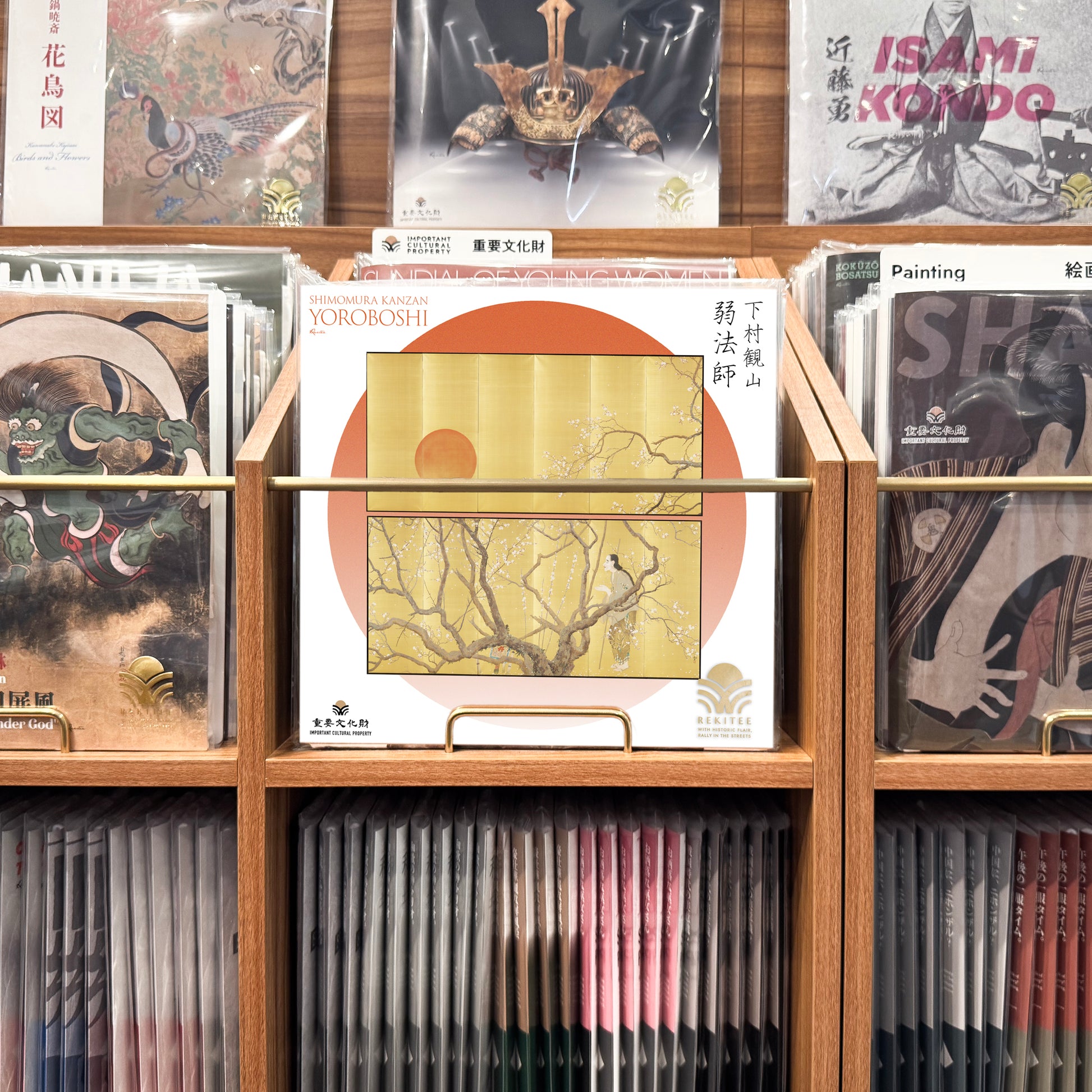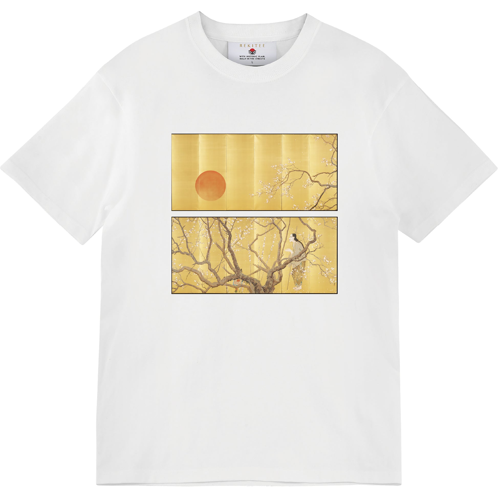 This folding screen depicts a scene from the Noh play "Yoroboshi," part of the traditional Japanese performing art known as "Noh." It portrays the blind monk worshiping the setting sun of the equinox in a garden filled with plum blossoms. The monk’s face evokes the essence of a Noh mask, reflecting Kanzan’s deep understanding of Noh theater.