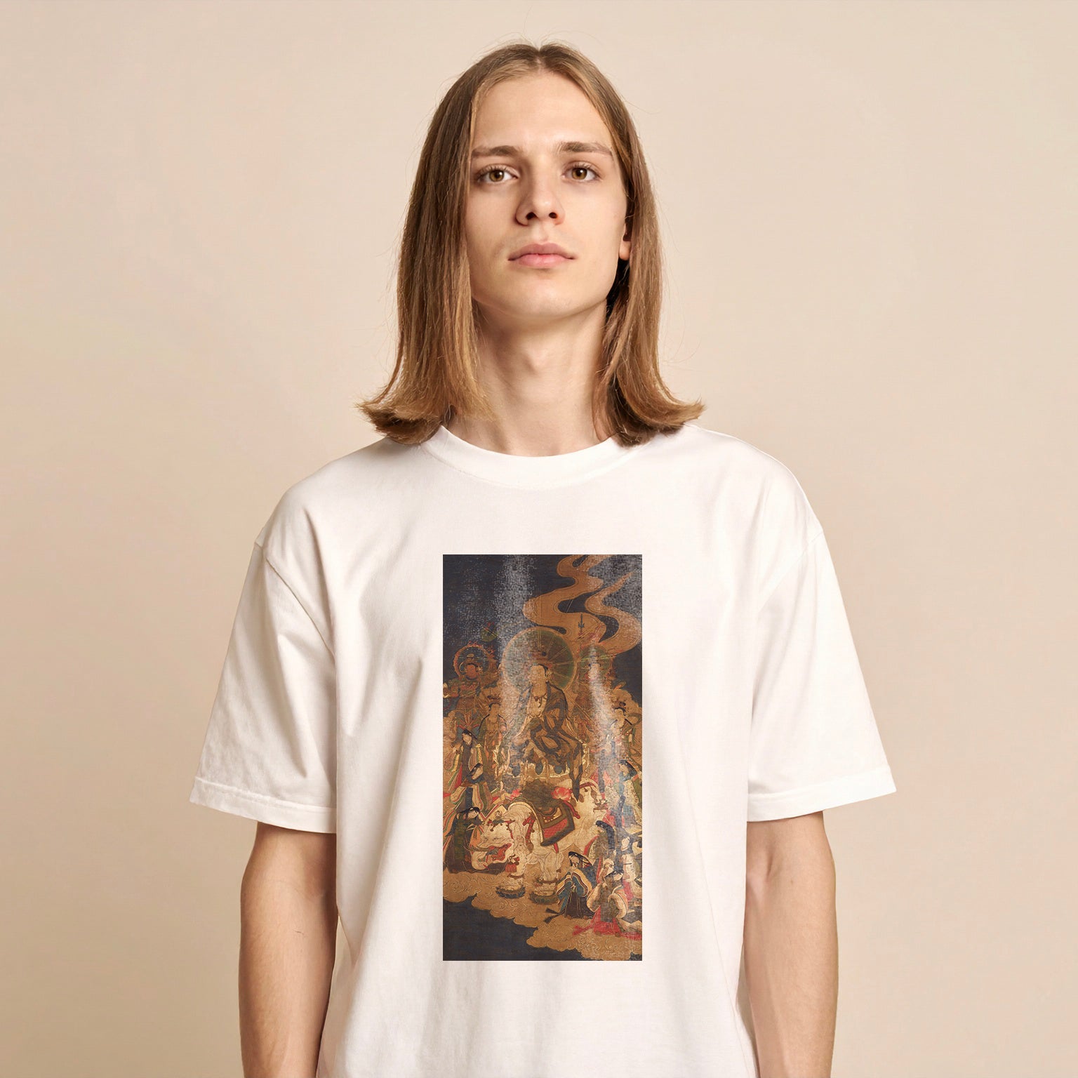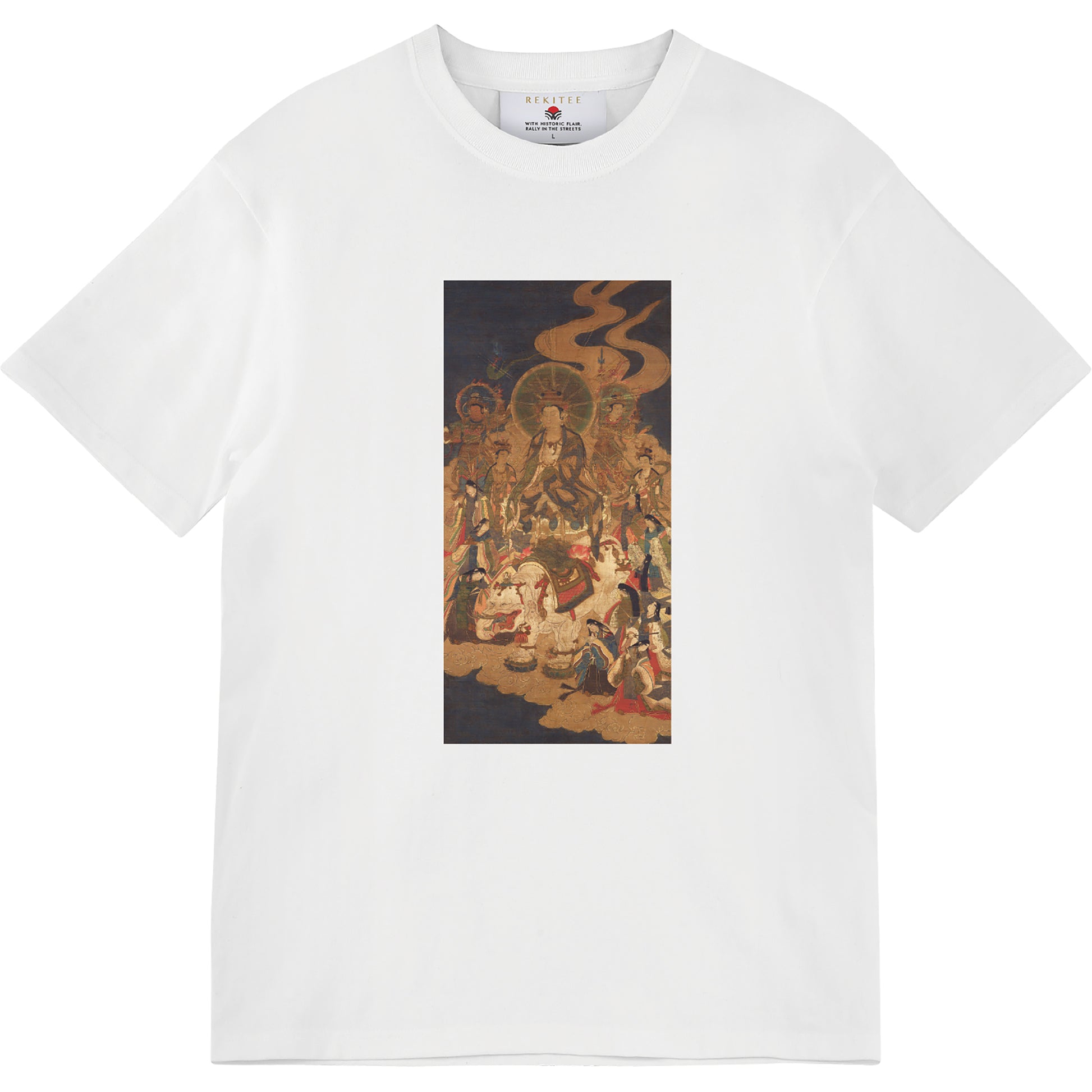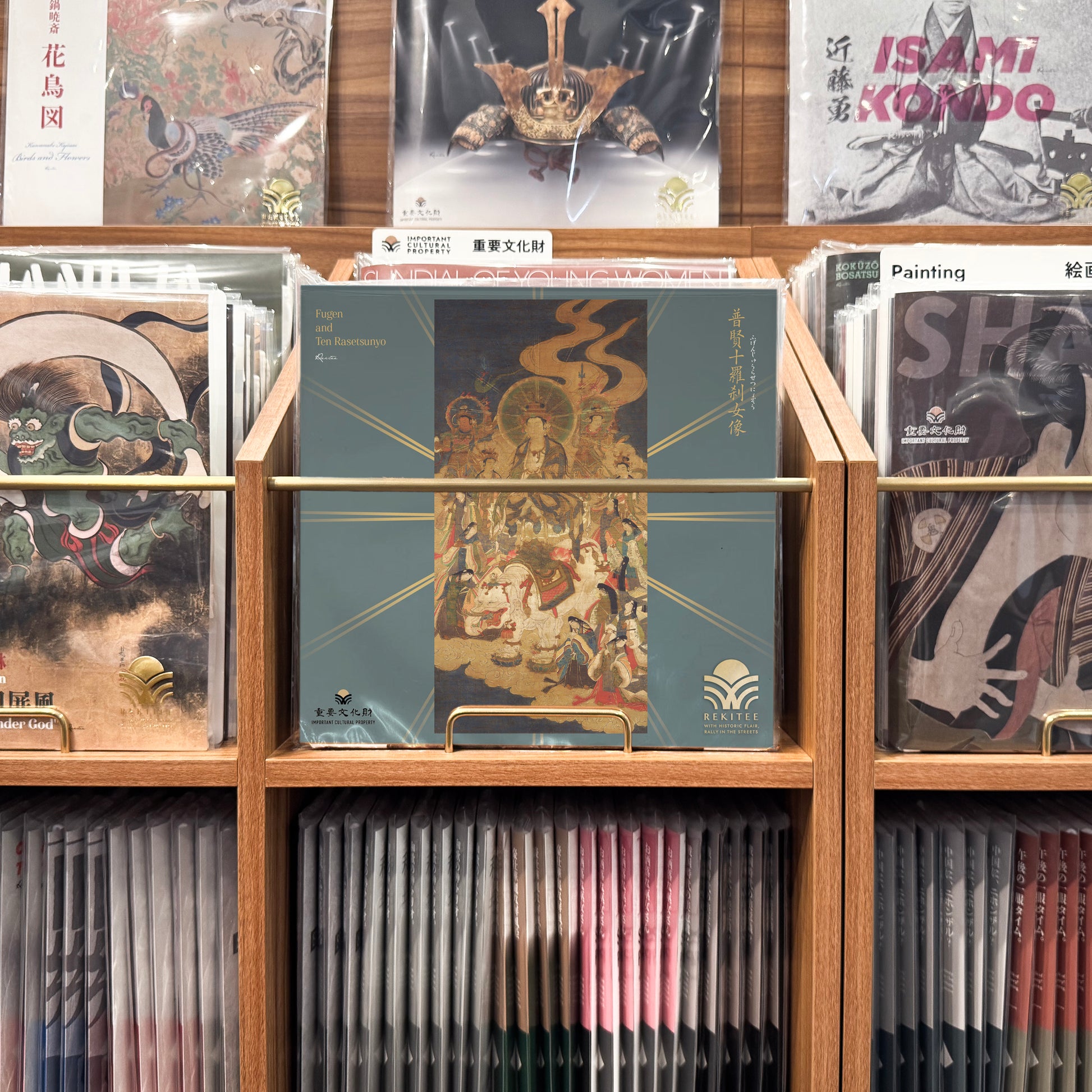 This 13th-century work depicts Fugen Bosatsu and the Ten Rasetsunyo, along with Kishimojin and other deities. Fugen Bosatsu is a bodhisattva associated with mental stability and the protection of devotees of the Lotus Sutra. The Ten Rasetsunyo are female demon deities who, having converted to Buddhism, now serve as its protectors. Fugen Bosatsu is shown in the Chinese Song style, while the Ten Rasetsunyo and Kishimojin wear traditional Japanese twelve-layered kimono.