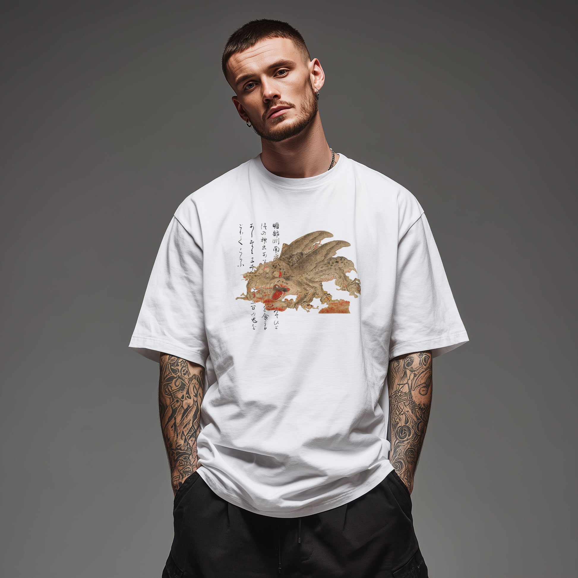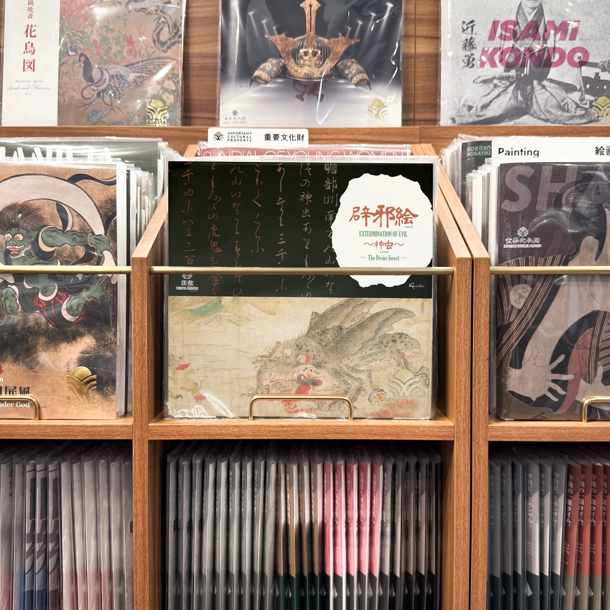This artwork depicts Shinchū, who exterminates evil spirits that cause harm and illness. Thought to be a glorified form of the silkworm or an imagined being with features of spiders, dragons, and other creatures, Shinchū was said to devour 3,000 tiger demons in the morning and 300 at night. In this scene, skulls and flesh—likely from demons already eaten—lie scattered, while another demon struggles to escape its grasp.