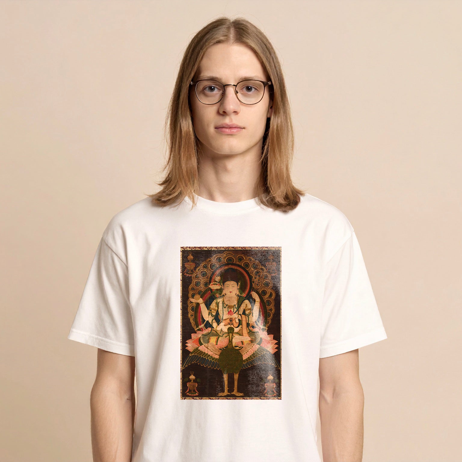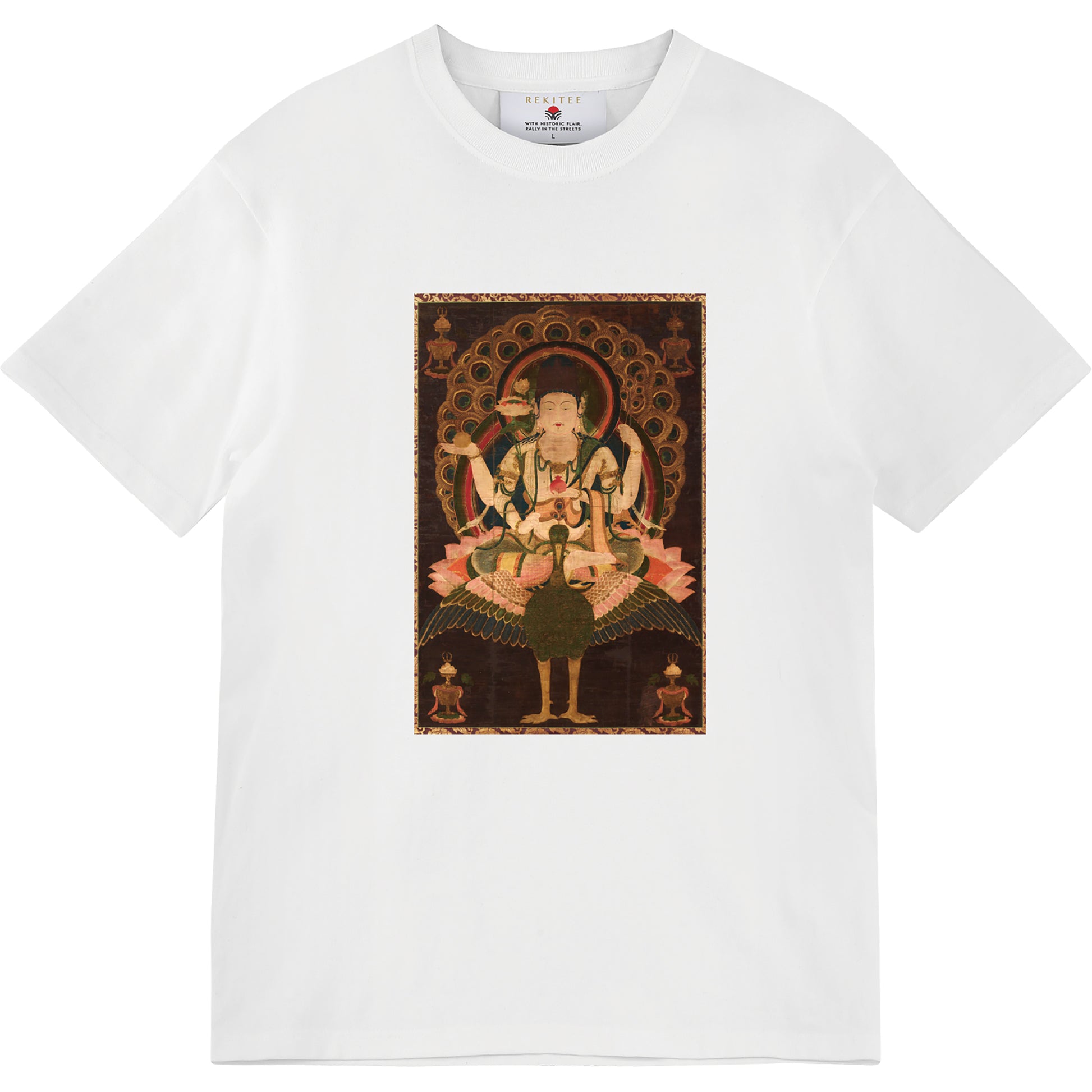 This 12th-century Buddhist painting of the Peacock Wisdom King is designated as a National Treasure. The Peacock Wisdom King is a deity in Esoteric Buddhism, believed to have the power to dispel suffering and misfortune, symbolized by the peacock's ability to eat poisonous snakes. The deity is depicted seated on a peacock with its wings spread wide, possessing four arms. In her hands, she holds a lotus flower, peacock feathers, and fruits associated with mythology.